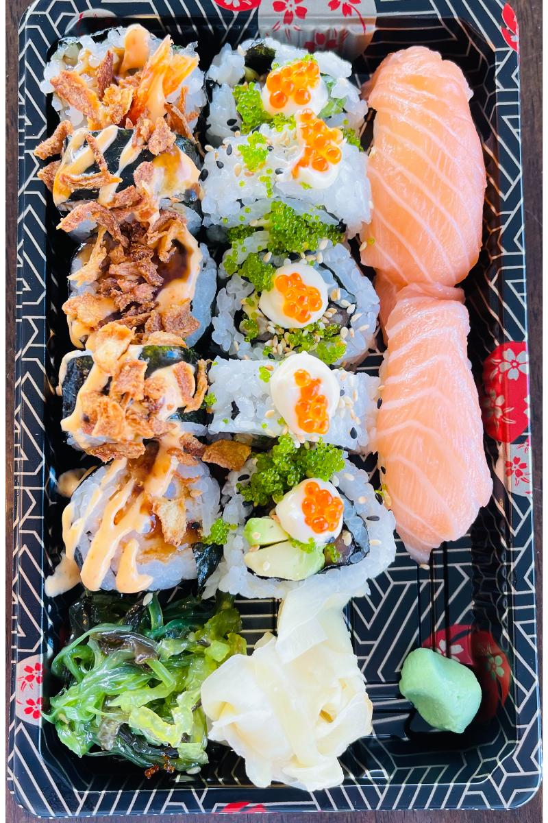 5 biter california. fylt med laks og tunfisk tartar (veldig lite tunfisk), smakt med sesam og vårløk. toppet med grønn tobikko, trøffelmajones, sesamfrø og ørretrogn.
