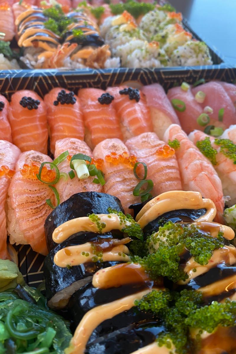 10 Hot & Dirty biter salmon, Toppet med syltet ingefær, wakame, sprø løk, vårløk, sesamfrø, rød og sort tobikko, wasabi majones, Teriaki saus og chili majones. Chilimajones er veldig sterk så om du vil ha den mindre sterk så skriv at du vil ha mindre eller ingen majones.