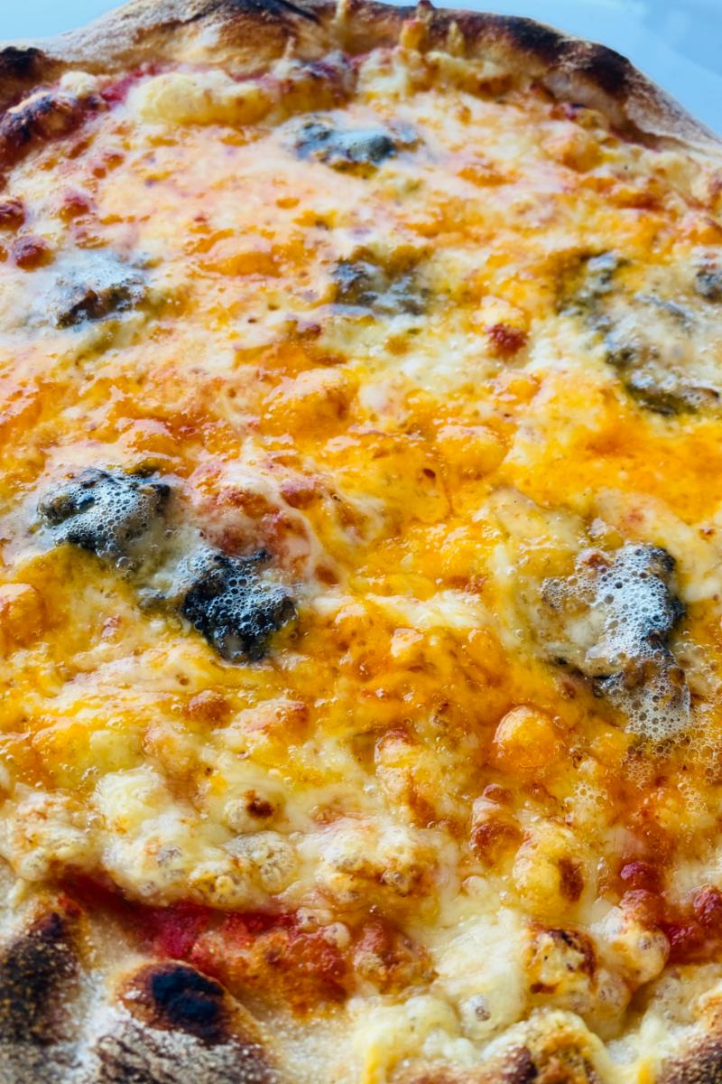 Surdeigsbunn med tomatsaus toppet med revet mozzarella, fersk mozzarella, cheddar og gorgonzola. olivenolje og basilikum