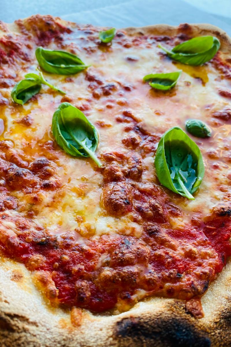 Surdeigspizza med tomatsaus, revet mozzarella, fersk mozzarella, olivenolje og basilikum.