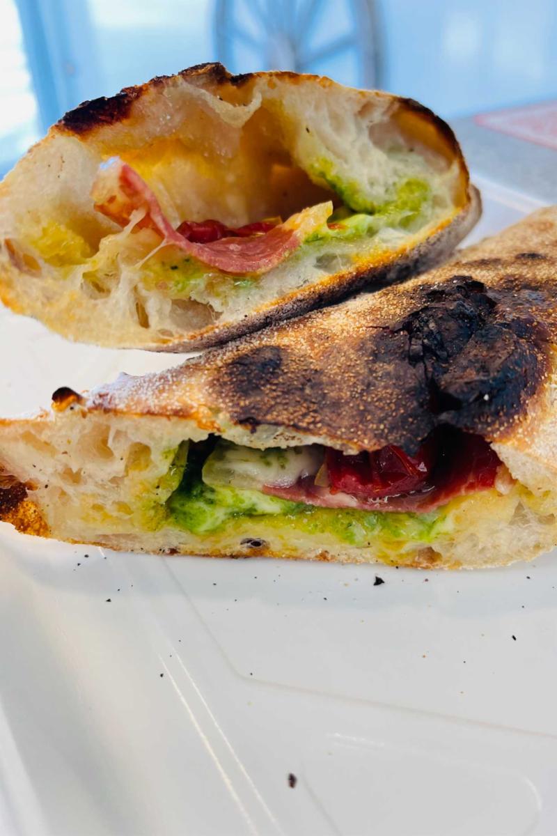 surdeigs calcone fylt med pesto, pepperoni, mozzarella og basilikum