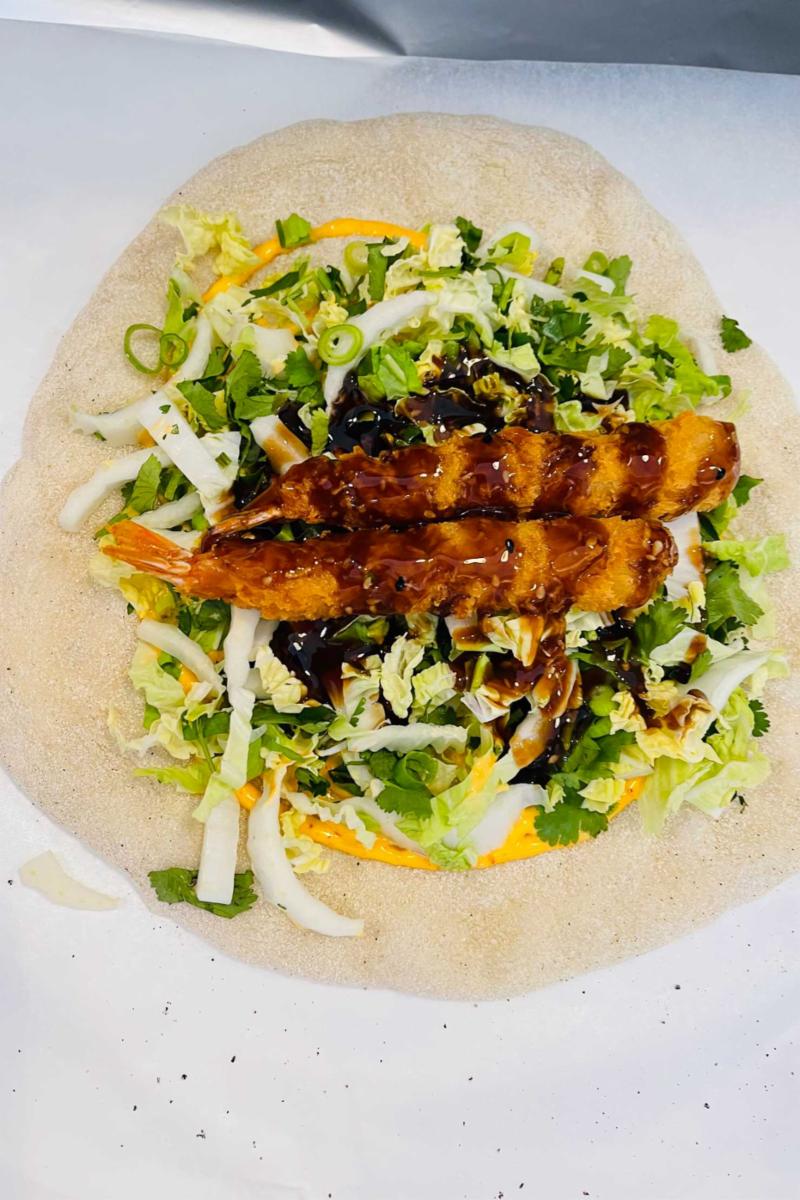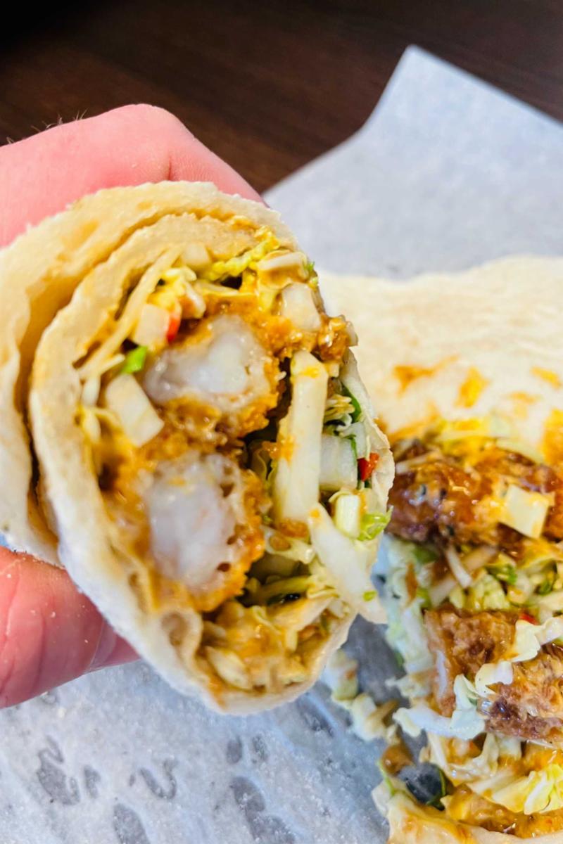 Deilig nystekt surdeigsrull fylt med sprø scampi, salat, chilimajones og teriyakisaus.
