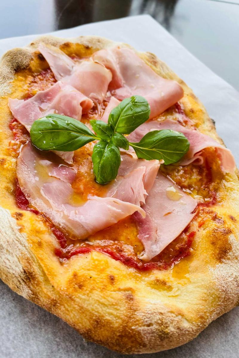 Surdeigspizza med tomatsaus, revet mozzarella, lettrøkt herregård skinke, olivenolje og basilikum.