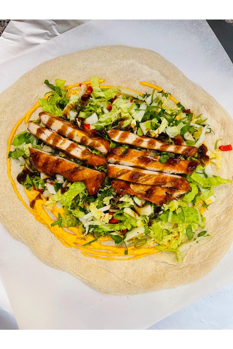 Deilig nystekt surdeigsrull fylt med grillet kyllilng, salat, chilimajones og teriyakisaus.