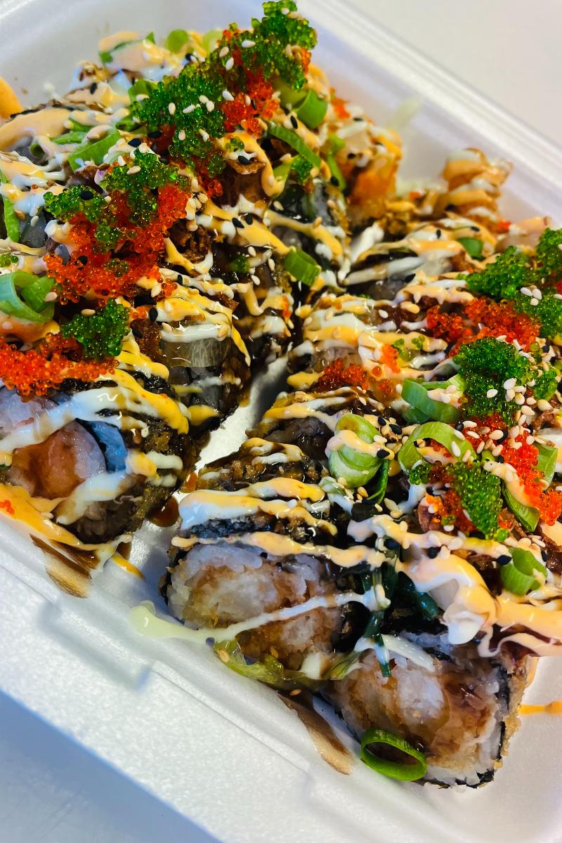 10 Hot & Dirty biter salmon, Toppet med syltet ingefær, wakame, sprø løk, vårløk, sesamfrø, rød og sort tobikko, wasabi majones, Teriaki saus og chili majones. Chilimajones er veldig sterk så om du vil ha den mindre sterk så skriv at du vil ha mindre eller ingen majones.
