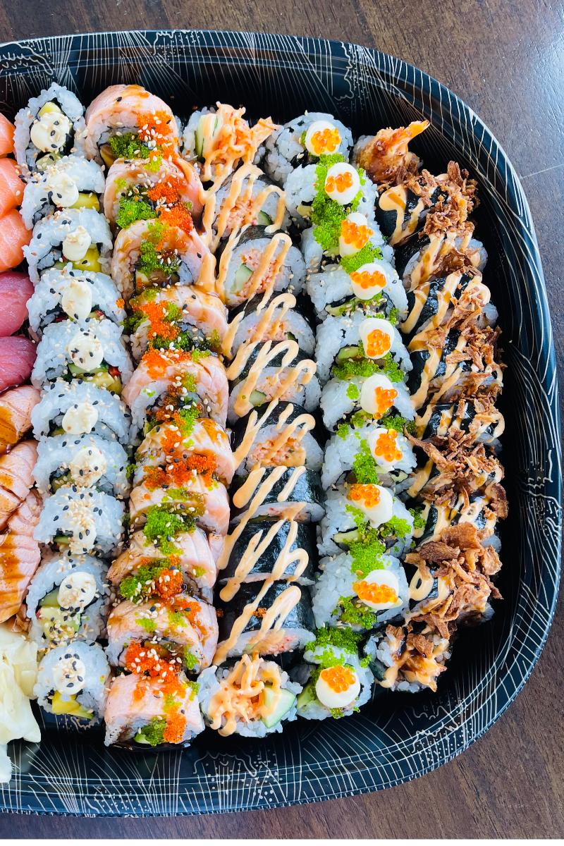 10 Hot & Dirty biter salmon, Toppet med syltet ingefær, wakame, sprø løk, vårløk, sesamfrø, rød og sort tobikko, wasabi majones, Teriaki saus og chili majones. Chilimajones er veldig sterk så om du vil ha den mindre sterk så skriv at du vil ha mindre eller ingen majones.