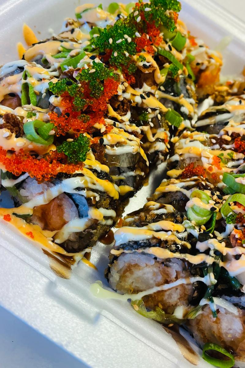10 Hot & Dirty biter fylt med surimi long crabstick. Toppet med syltet ingefær, wakame, sprø løk, vårløk, sesamfrø, rød og sort tobikko, wasabi majones, Teriaki saus og chili majones. Chilimajones er veldig sterk så om du vil ha den mindre sterk så skriv at du vil ha mindre eller ingen majones.