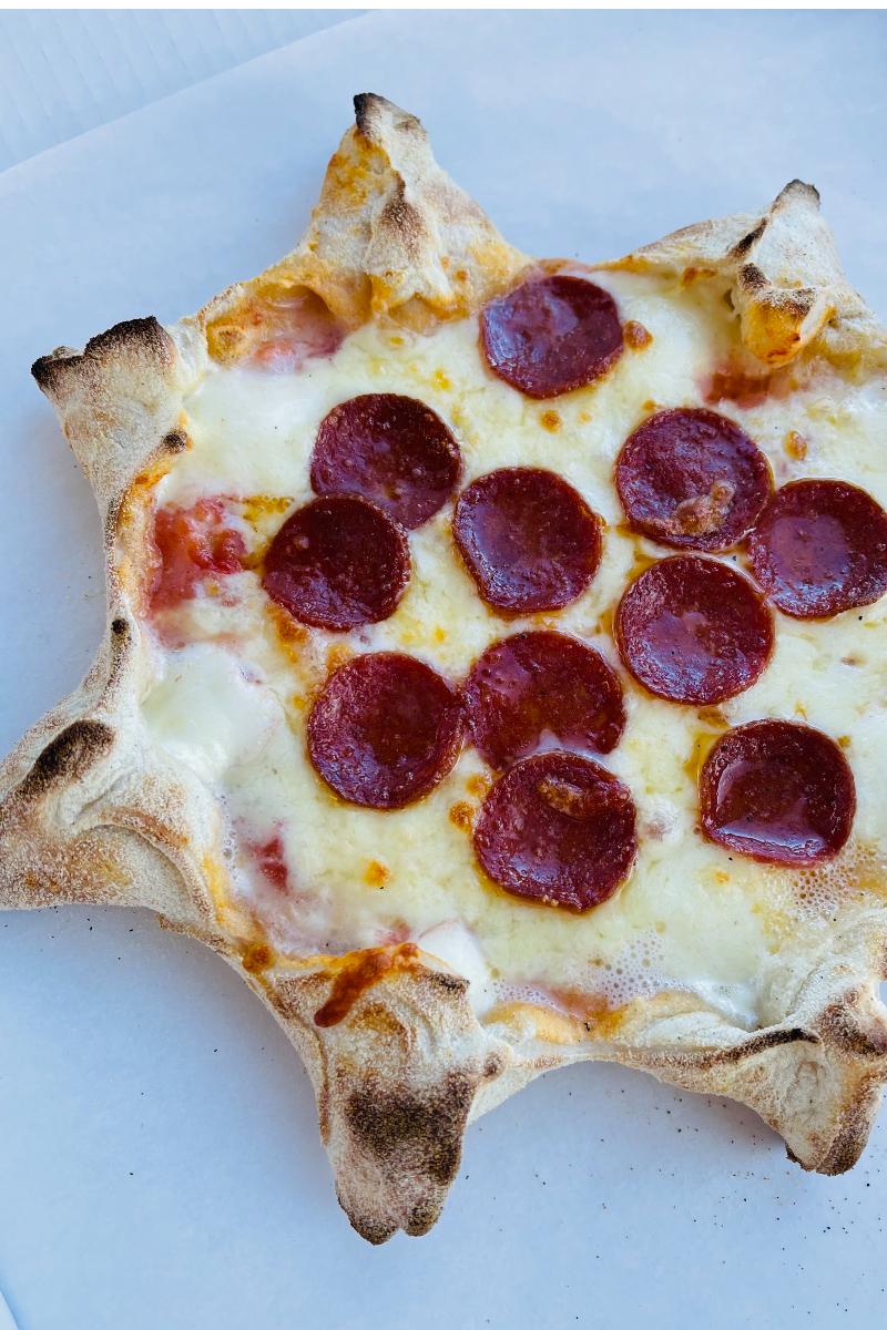 Denne pizzaen er min sønn Jonas sin favoritt pizza og som han også har funnet opp. Den blir delt opp i kantene og fylt med fersk mozzarella. så godt med vår spesial osteblanding og pepperoni.