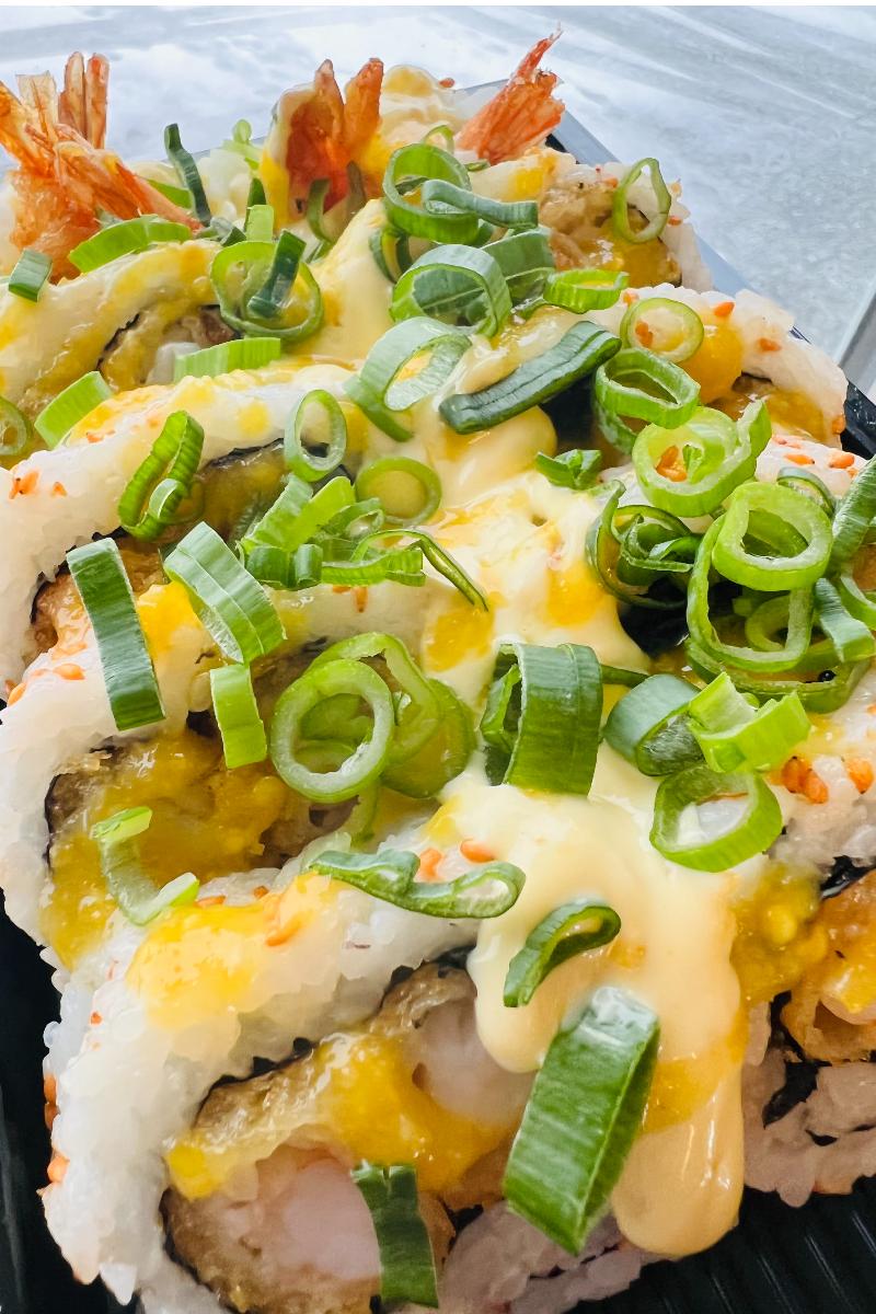 Vi topper dette med kim chee sesamfrø, Lemon drop chili majo og saus samt vårløk.