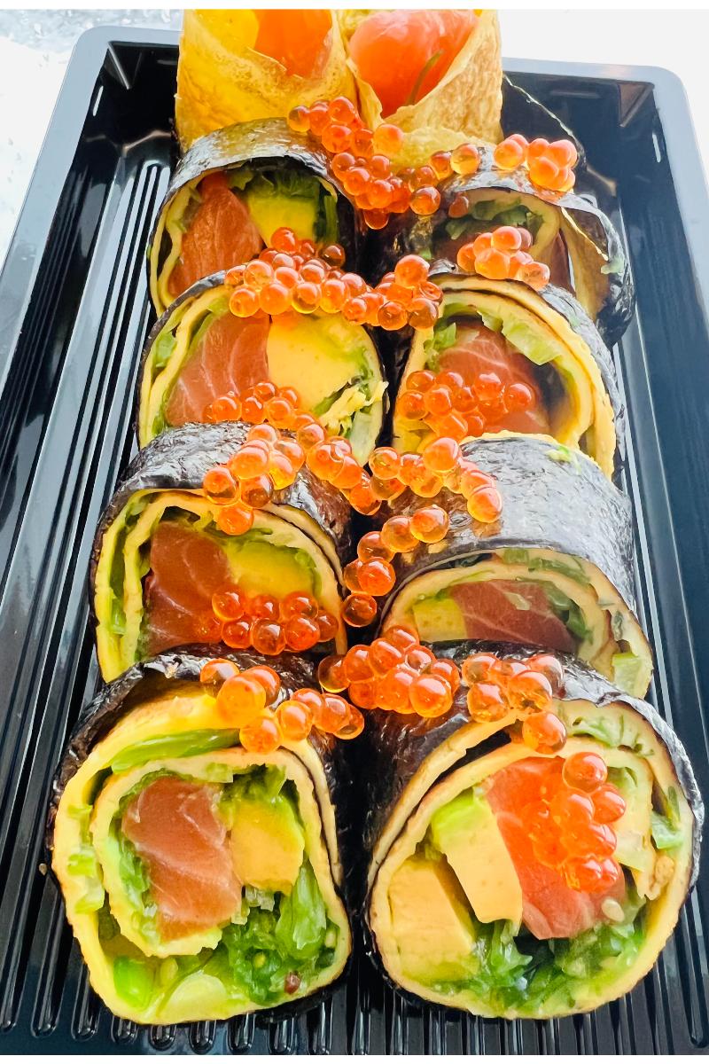 vi fyller dette med førsteklasses laks og avokado og topper dette med ørretrogn.